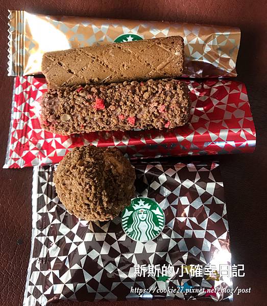 星巴克星願桶裡面有三種種類的餅乾,包裝分別是淺咖啡色(裡面是咖啡捲心酥),深咖啡色(裡面是白巧黑露脆芙)及紅色(裡面草莓巧克酥捲),斯斯個人最喜歡的是草莓巧克酥捲,外皮有脆脆的巧克力及草莓的脆粒,吃起來還有莓果的香氣,口感很新鮮,挺不錯吃的。
