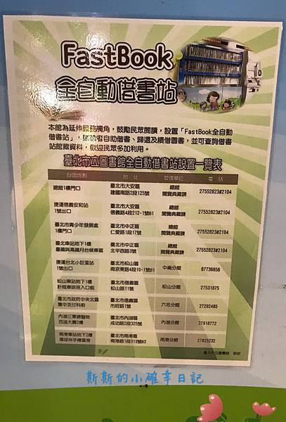 昨天斯斯在南港車站準備坐火車時在B2的伴手禮區看到了這台臺北市立圖書館全自動借書站Fastbook,其實這個機器斯斯之前就有看過及使用過,對於通勤的人來說真的挺方便的,可以借本書在坐車的時候看,比較不會無聊,也不會在坐車時一直滑手機,影響視力,另外多看書也可以得到一些不同方面的知識,看書真的是最便宜的投資,尤其又有這麼方便的借書管道,希望大家有機會的話都能多加利用這個Fastbook的機器
