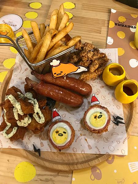 上週六(2017/12/16 Sat)斯斯和姐姐及她的二個女兒前往位於台北sogo附近的蛋黃哥主題餐廳,真的是好好吃又好好拍啊~~我們點了懶得想炸物拼盤480+總滙海鮮Pizza280+二杯焦糖海鹽風味拿鐵180x2+二瓶雙層水果冰沙220x2 懶得想炸物拼盤480 總滙海鮮Pizza280 焦糖海鹽風味拿鐵180